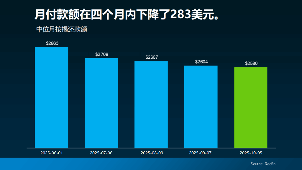 这种变化最明显的体现就是月供的下降。最新的Redfin数据显示,中位价房屋的按揭月供比几个月前下降了283美元(见下图):