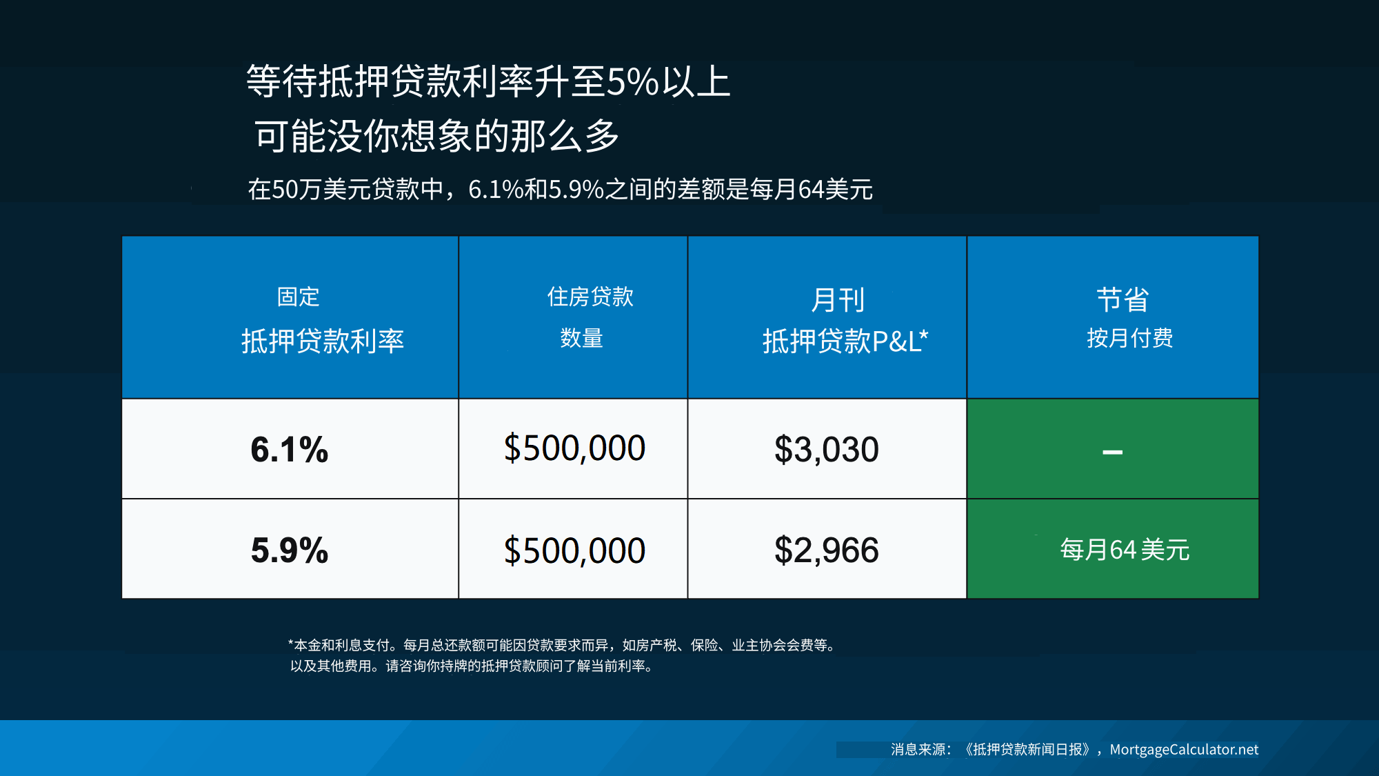 蓝绿矩形框,白色文字是的,随着时间推移,每月64美元会累积起来。但这远没有许多买家想象的那种剧烈变化,当他们说自己在“等待5%利率”时。